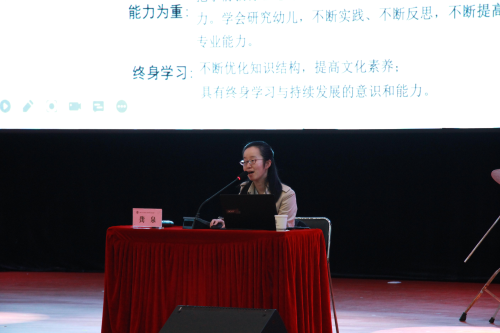 龚老师强调,学前教育学子要以16字为基准:师德为先,幼儿为本,能力为重,终身学习。在日常的工作学习中,要教导幼儿们,平等对待,关爱每一位儿童。 “游戏即课程,自由出天使。”我们要学会帮助学前儿童发挥潜质,正确引导、学习品质习惯,以“青春伴孩子”,让“孩子成为孩子”。