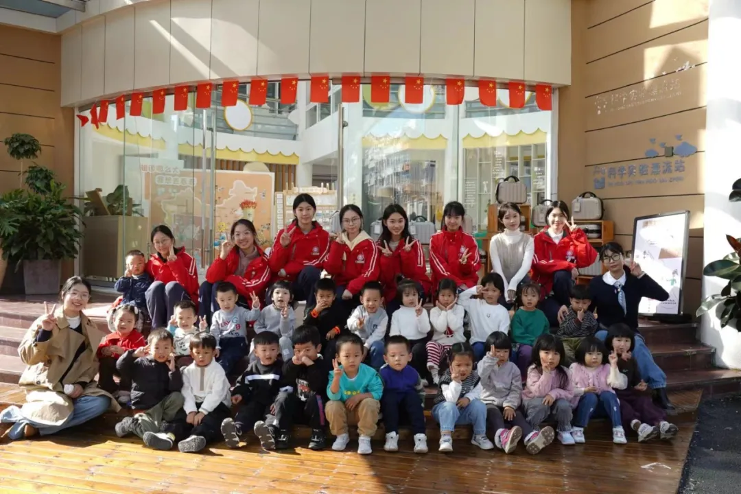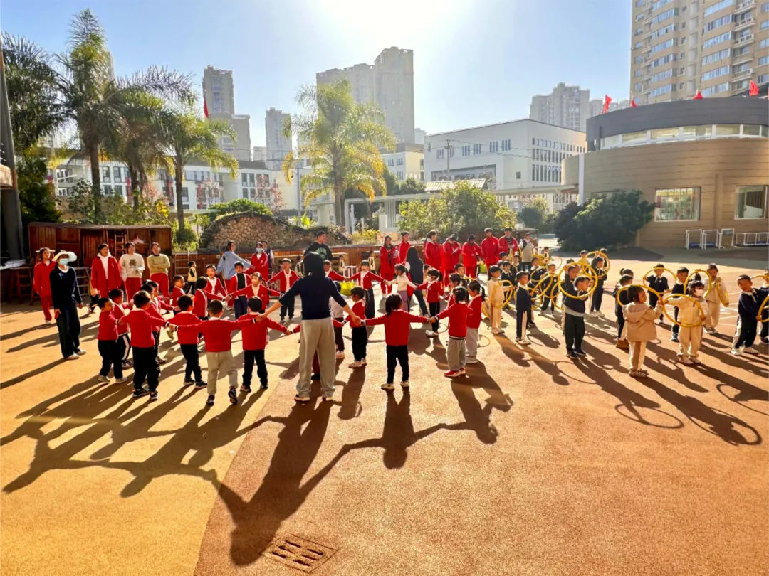一日之计在于晨!在共同迎接幼儿入园后,同学们集中操场,观摩幼儿园的晨间体锻活动。晨间活动丰富、有趣,幼儿们活力满满,欢乐的氛围感染着每一位同学。同学们也情不自禁地与小朋友们互动玩耍,大手牵起小手,建立起了最初的信任。