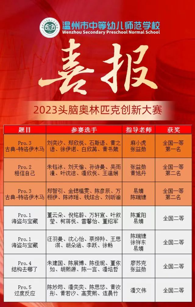 在2023年世界头脑奥林匹克选拔赛中,我校共7支队伍参赛,均获佳绩。其中1支队伍获全国一等奖第一名,2支队伍获全国一等奖第二名,余下4支队伍获全国二等奖。这是继我校学子在2022年省市级头脑奥林匹克活动比赛中荣获奖项后的又一大喜讯。