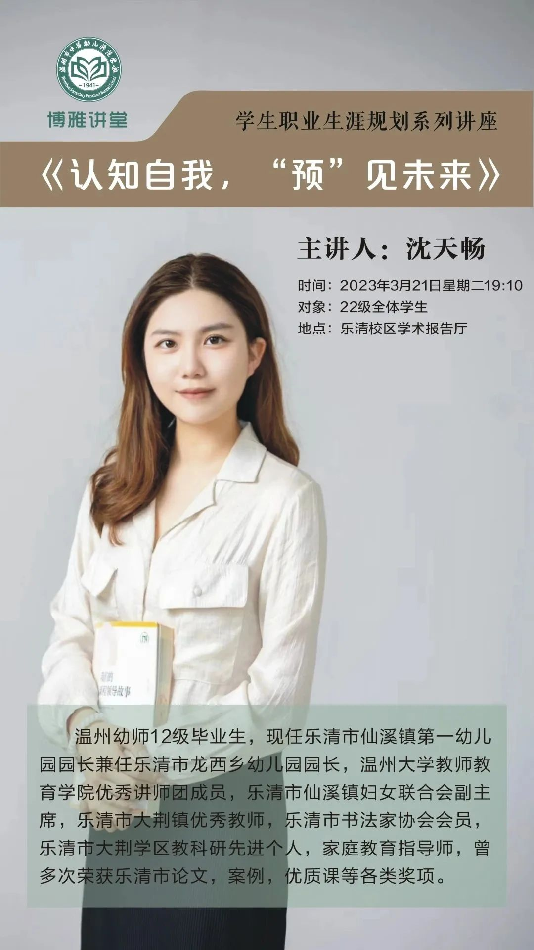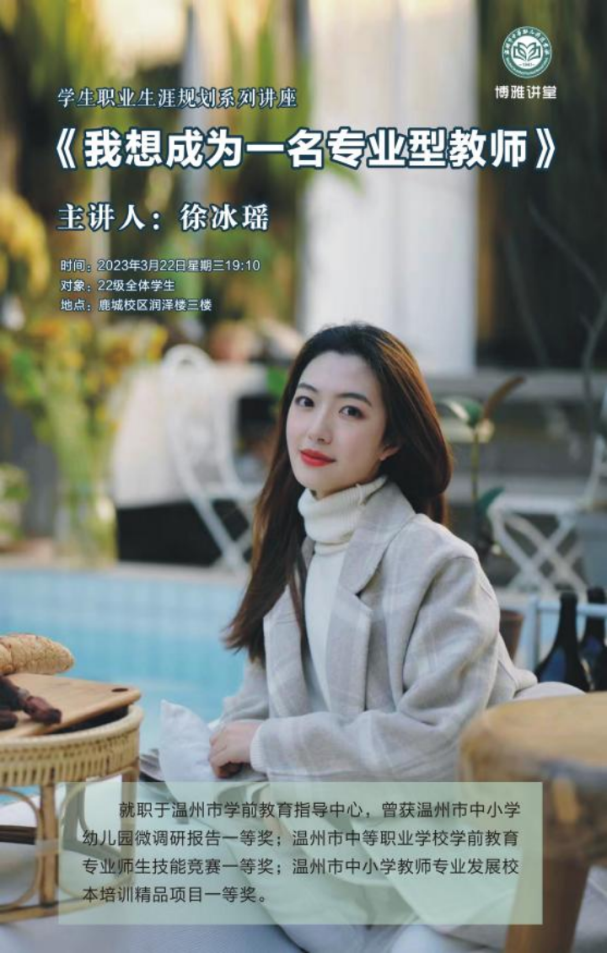 2023年3月21日、22日晚,我校邀请了温州市学前教育指导中心徐冰瑶老师和乐清市仙溪镇第一幼儿园沈天畅园长分别为乐清校区、鹿城校区2022级学生开展职业生涯规划讲座。