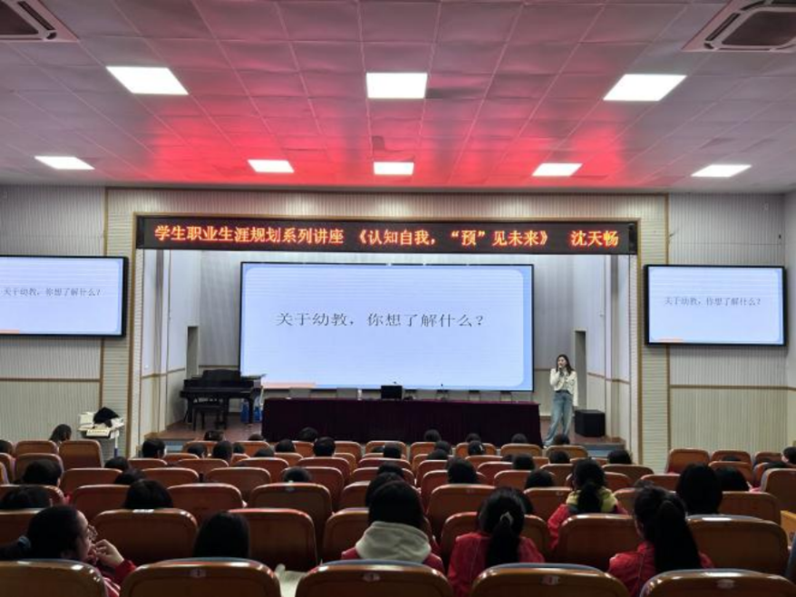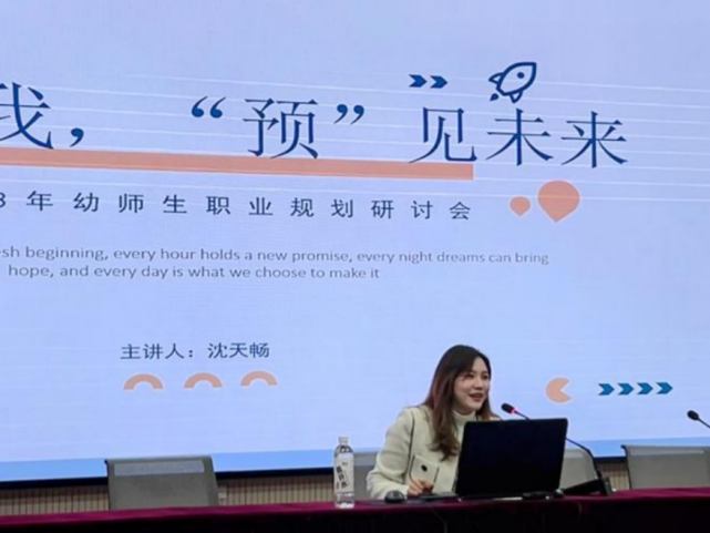 沈天畅园长为乐清校区22级同学带来了题为《认知自我,“预”见未来》的讲座。她生动地讲述了自己在考编及工作中发生的趣事。而后,沈园长还提出的两个问题,“你希望以后做什么工作”“关于幼教,你想了解什么”,引发了同学们的好奇和思考。