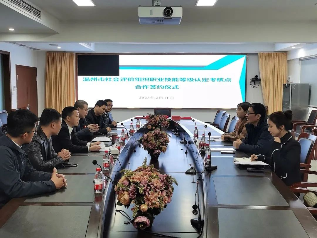 为深入推进职业技能人才评价制度改革,加快建立技能人才评价体系,发展壮大工匠人才和高技能人才队伍建设。2023年2月11日上午,我校党总支书记、校长蒋高烈及实训处干部一行人赴平阳县人力社保局和平阳县华夏职业培训学校就社会评价组织职业技能等级认定考点一事合作签约。平阳县人力社保局党组书记、局长林初潮,党组成员、副局长谢倜,就业训练中心主任金成叶,平阳县职业中等专业学校副校长余海波,平阳县职业教育中心党总支书记、校长蔡小鲁出席活动并见证了合作签约。签约仪式由林初潮局长主持。
