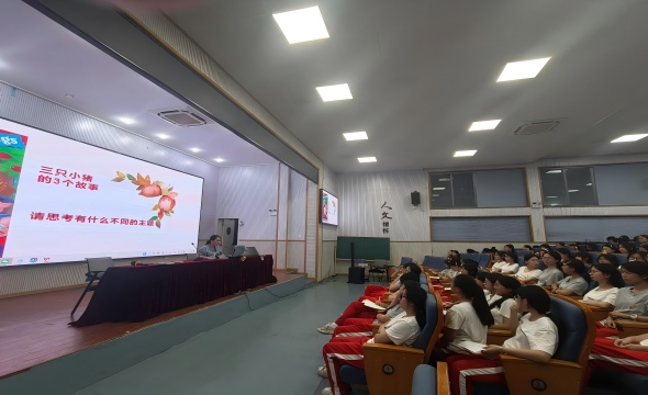 讲座伊始,陈老师以儿童剧评分标准引入主题,让同学们明白儿童剧要点在于主题、人物、情节和儿童性。陈老师先以三个版本的三只小猪为同学们诠释了主题的多元性,并引入《3-6岁儿童发展指南》作为同学们创作的基础。再对比适合幼儿园小班原创儿童剧《猴子捞月亮》和民间故事,初步感知儿童剧的要素。最后分享《奇妙玩具店》《时光环游记》两个优秀原创儿童剧,理解矛盾冲突,情节的一波三折和典型人物的典型性格。最后以游戏性结束,在儿童剧中加入一些好玩的游戏,如数花瓣、唱歌跳舞、对对子、跳绳等,让儿童剧成为潜移默化的教育的工具。